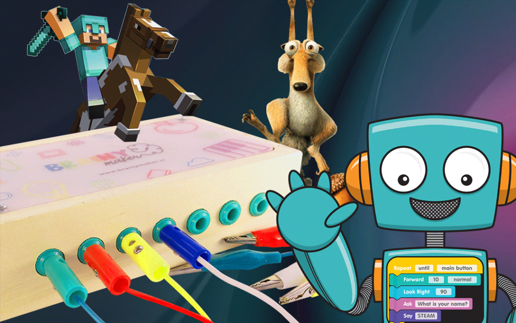 La programación por bloques implica encastrar piezas pre diseñadas (como en un rompecabezas) de forma tal que se genere una lista de pasos o acciones a seguir para solucionar un problema planteado o creado por el mismo participante. Es una manera práctica y visual de programar en entornos gráficos. Para iniciar en el mundo de la programación utilizamos la plataforma de nivel mundial llamada CODE.org donde contamos con una variedad de actividades y desafíos de juegos donde los participantes pueden aprender y ejercitar las prácticas computacionales con personajes de Minecraft, La era del Hielo, Frozen, y mucho más, que podemos combinar con la experiencia física y concreta de la consola BrainyMaker que permite crear juegos interactivos como un piano de fruta, joystick de plasticina, just dance con agua, y mucho más.